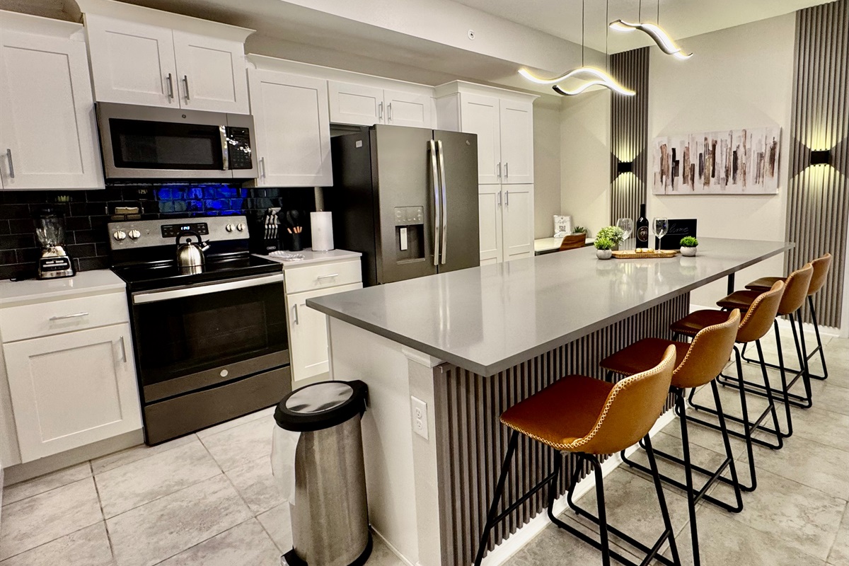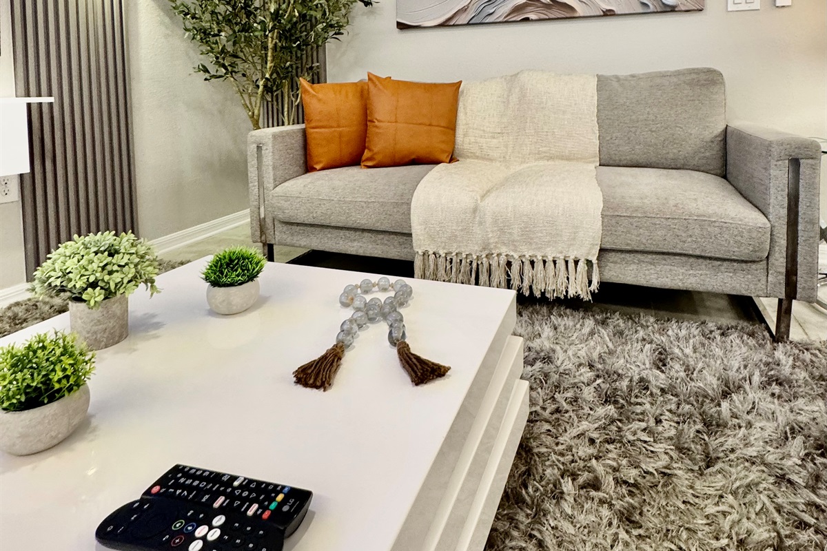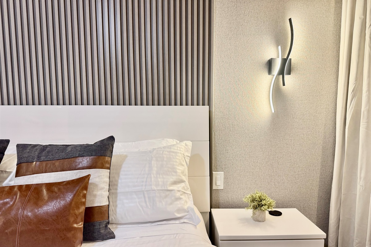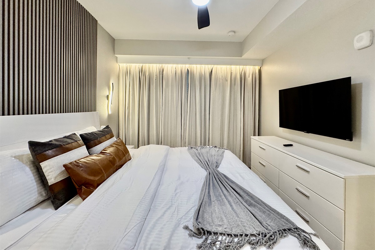 The open-concept living space boasts a spacious lounge area with a comfortable sofa seamlessly connected to the dining area and a fully equipped kitchen. Enjoy modern stainless steel appliances, elegant cabinetry, and all the essential utensils for a hassle-free and enjoyable stay.