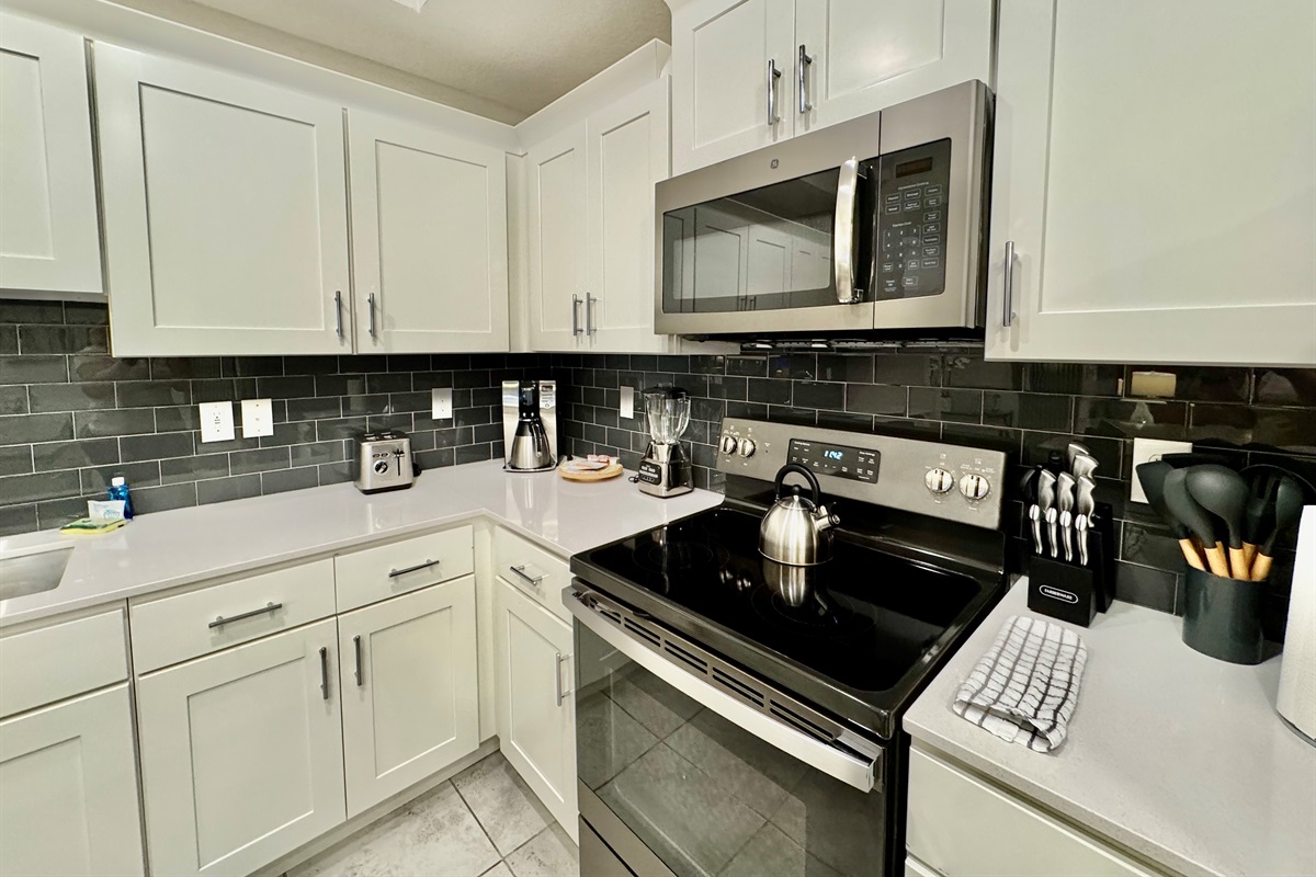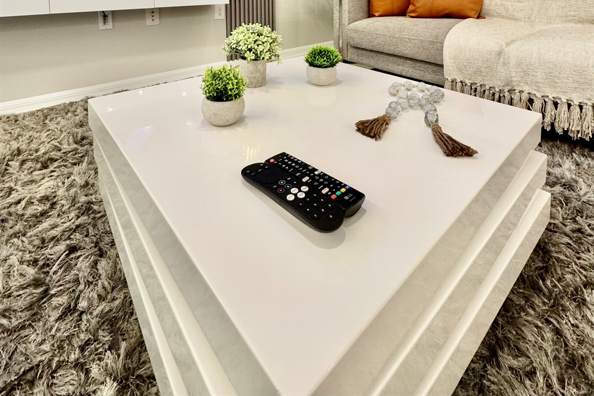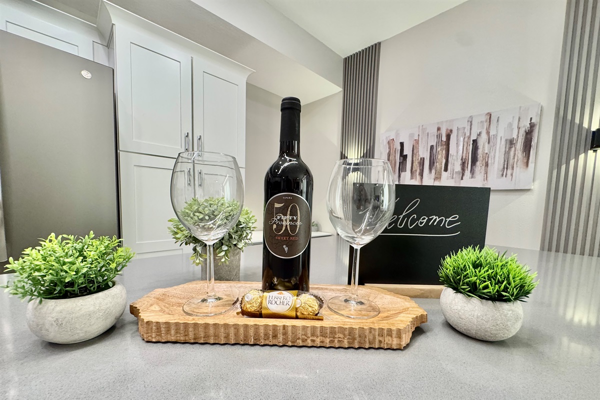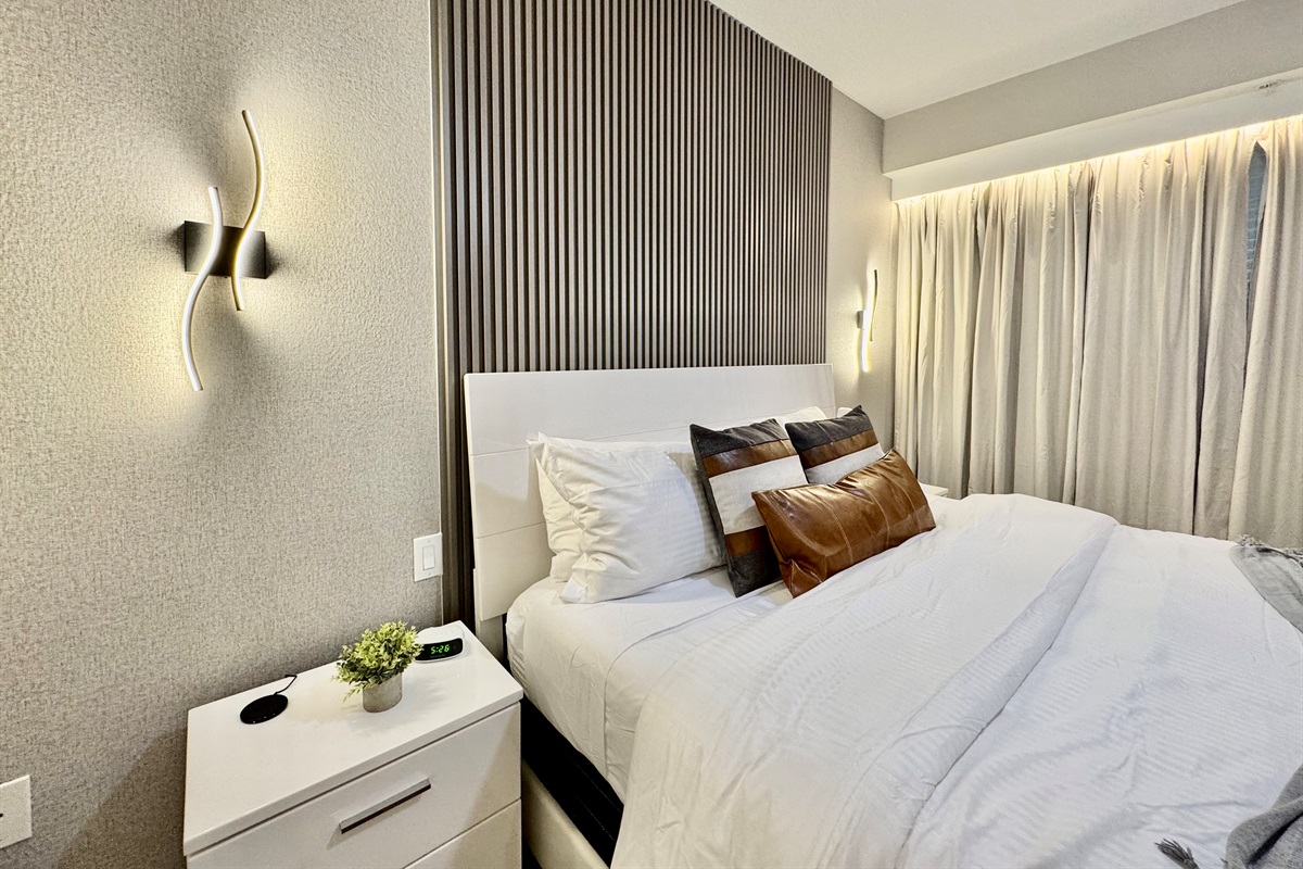 The open-concept living space boasts a spacious lounge area with a comfortable sofa seamlessly connected to the dining area and a fully equipped kitchen. Enjoy modern stainless steel appliances, elegant cabinetry, and all the essential utensils for a hassle-free and enjoyable stay.