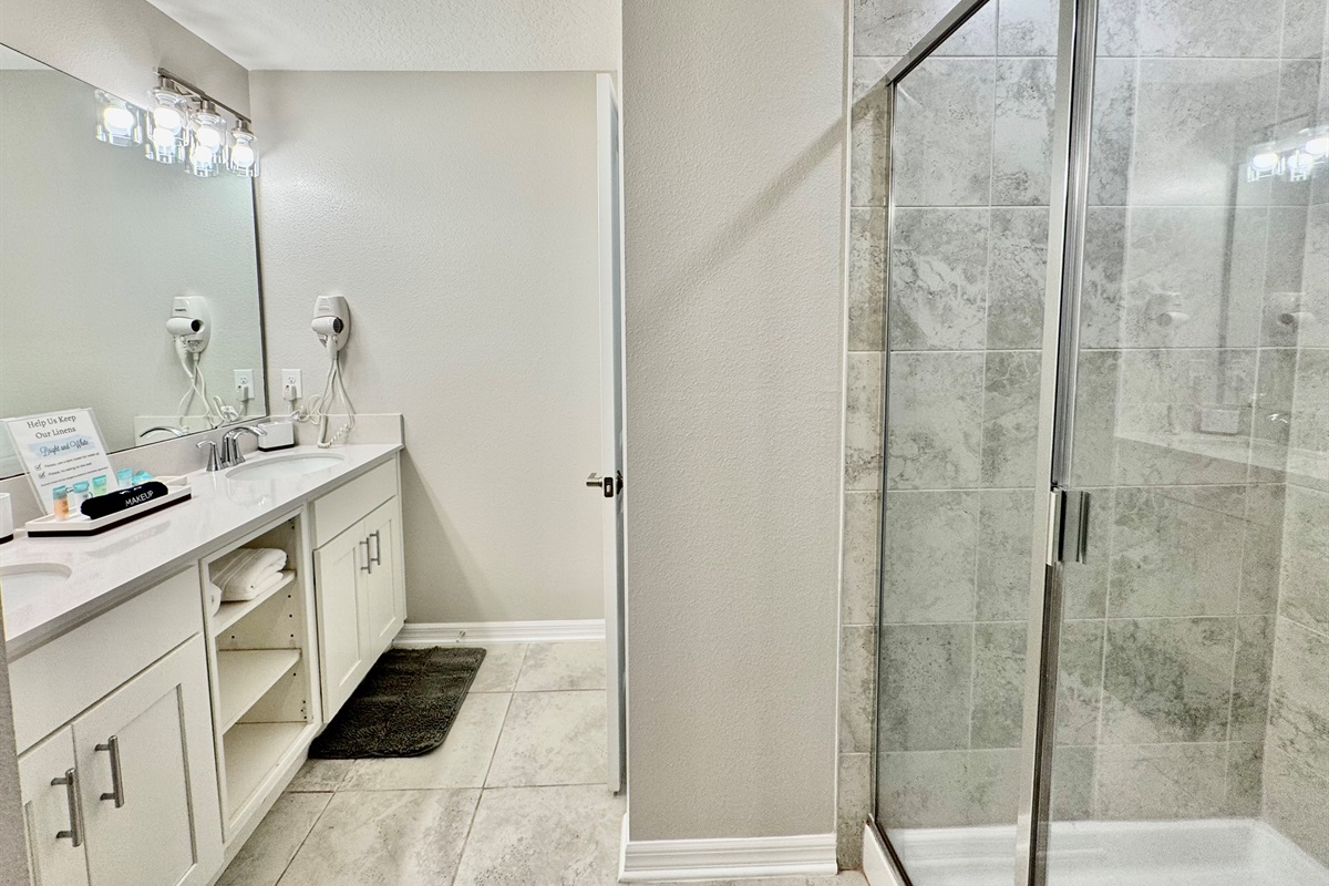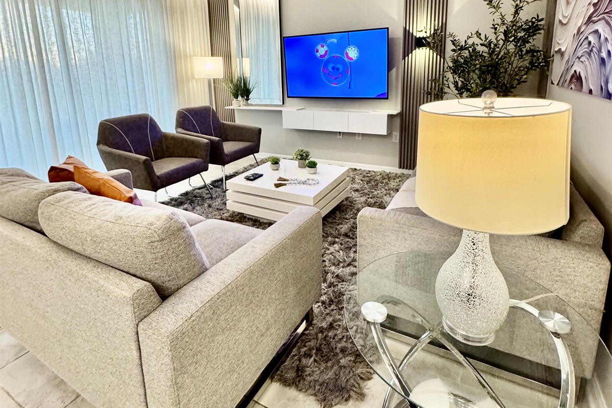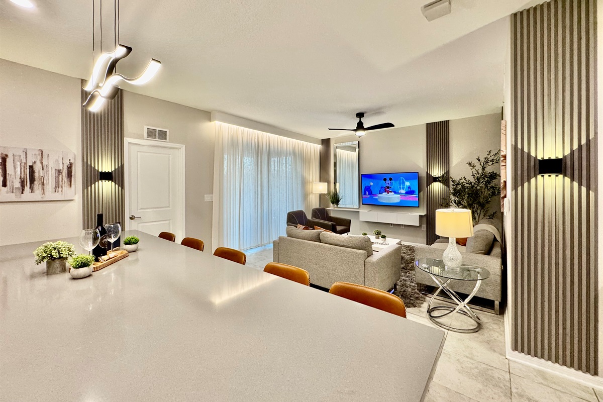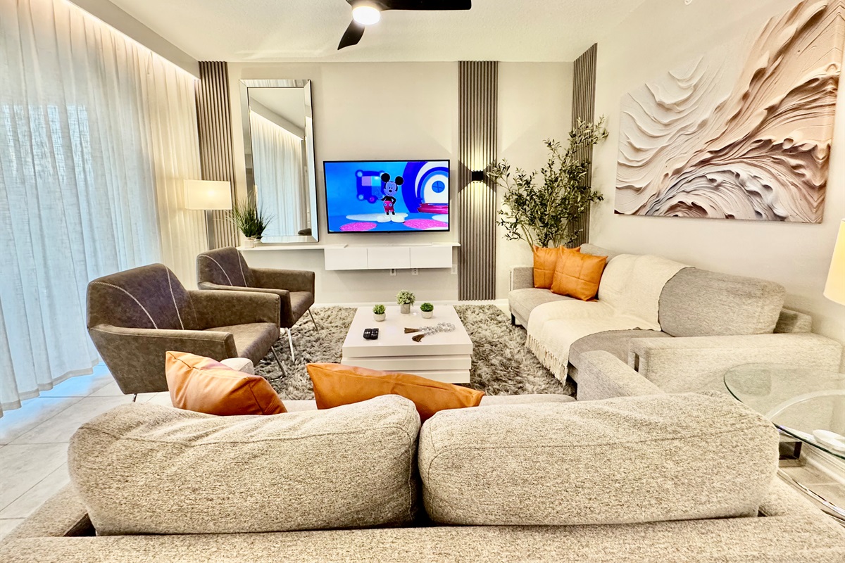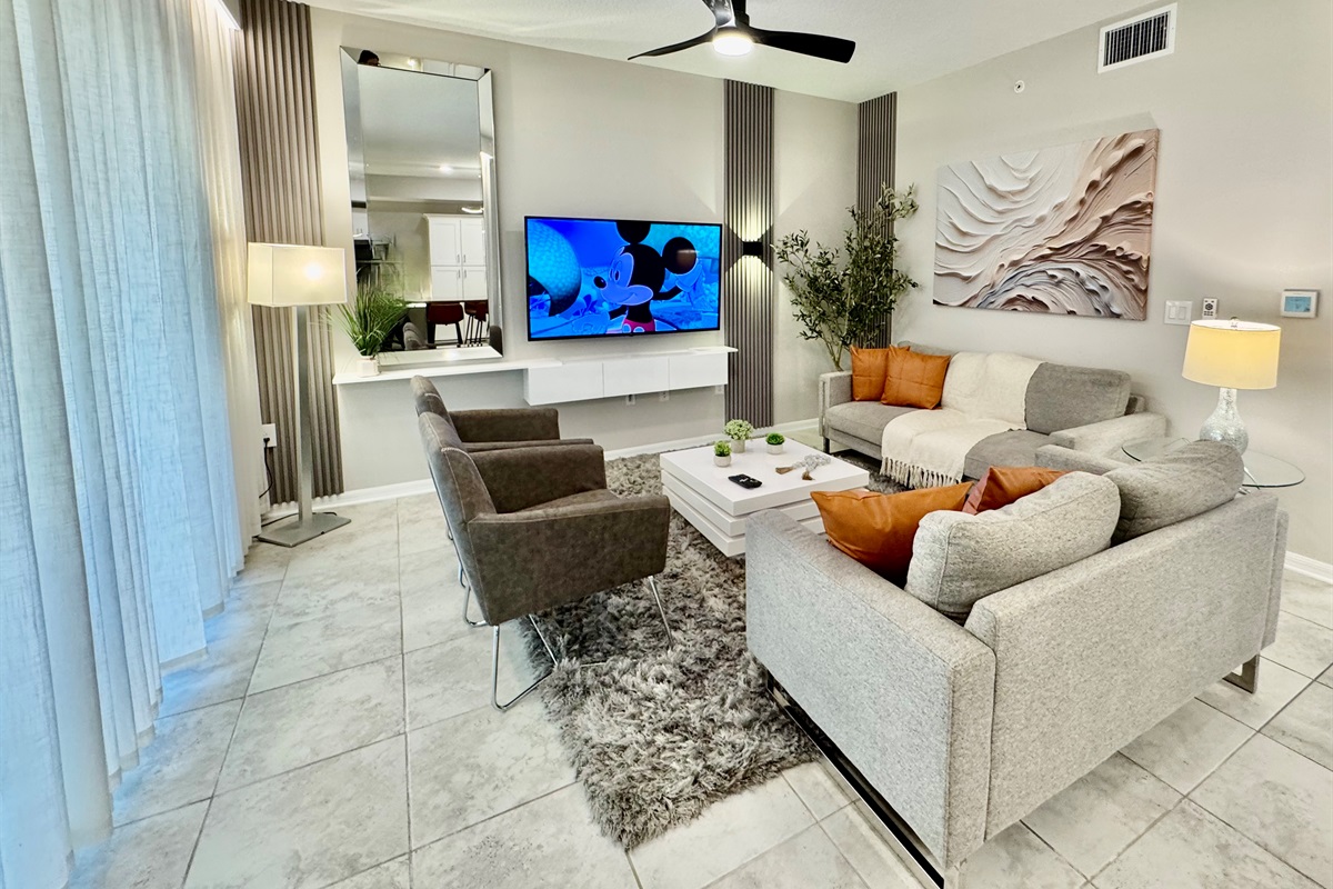 3 Bedrooms • 2 Bathrooms 2 Baths • Sleeps 1-7Welcome to this beautifully designed three-bedroom, two-bathroom apartment, perfect for families and groups of up to seven guests. The master bedroom features a chic ambiance with a luxurious king-size bed, while the two additional bedrooms each include a full bed and a twin bed delightfully decorated with a Stitch theme and the other with a queen bed with a charming Mickey and Friends touch.